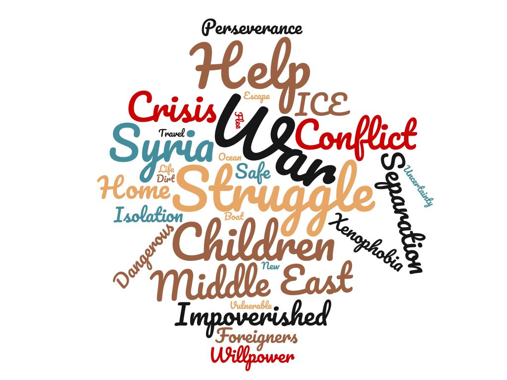 After gathering the words for the word association game, I was not surprised by the results. Many of these words fit the dominant cultural narratives surrounding refugees and their experience. The most repeated words, seen in large font, are “struggle”, “help”, and “war”. These worlds, as well as “crisis”, “conflict”, “escape”, “flee”, “separation”, and “vulnerable”, fit the overall theme of struggle. “Willpower”, “perseverance”, and “life” fit a promising trope.